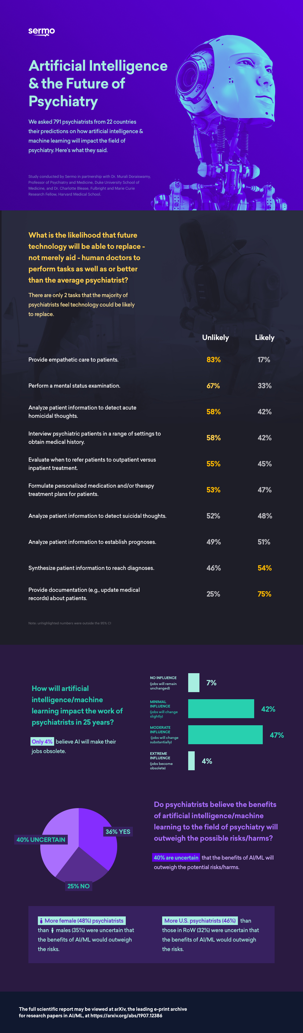 The line between reality, possibility (and conspiracy theory) certainly seems to blur! I have no particular ideological objection to these novel diagnostic methods; indeed, I’m a large proponent of letting the robots loose in medicine. An interesting final reflection is this graphic from a survey I was sent last year, capturing psychiatrist perspectives on these issues